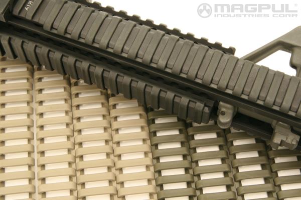 Ladder Panels offer very low-profile 1913 Picatinny rail coverage. The Santoprene material provide a rubbery surface for improved weapon control and rail protection. Easily cut for custom lengths, each panel fits one side of a carbine-length rail (18 slots). One panel per package. Manufactured by Falcon Industries, Inc.