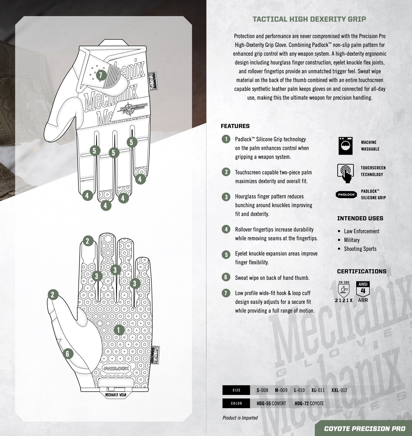 Beskyttelse og ydeevne går aldrig på kompromis med Precision Pro High-Dexterity Grip Glove. Kombinationen af ​​Padlock™ skridsikkert håndflademønster giver forbedret grebkontrol med ethvert våbensystem. Et ergonomisk design med høj fingerfærdighed, inklusive timeglasfingerkonstruktion, øjeformede knofleksled og rollover-fingerspidser, giver en uovertruffen aftrækkerfølelse. Svedafvisende materiale på bagsiden af ​​tommelfingeren kombineret med en komplet touchscreen-kompatibel syntetisk læderhåndflade holder handskerne på og forbundet til brug hele dagen, hvilket gør dette til det ultimative våben til præcisionshåndtering.