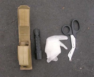 Holds (2) pair of protective gloves, medical mini flashlight, and one pair of trauma shears (Medical supplies sold separately).