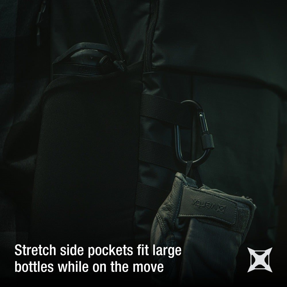 • Strækbare sidelommer passer til store flasker, mens hovedrummet er kompatibelt med drikkeblære.